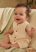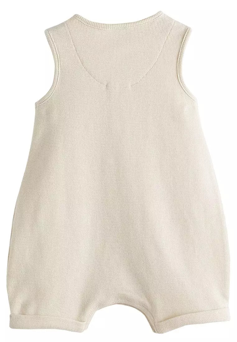 This adorable romper has a pure cotton construction with a comfortable sleeveless design, a crinkle textured finish, a button-up front and a popper fastening for easy changing.