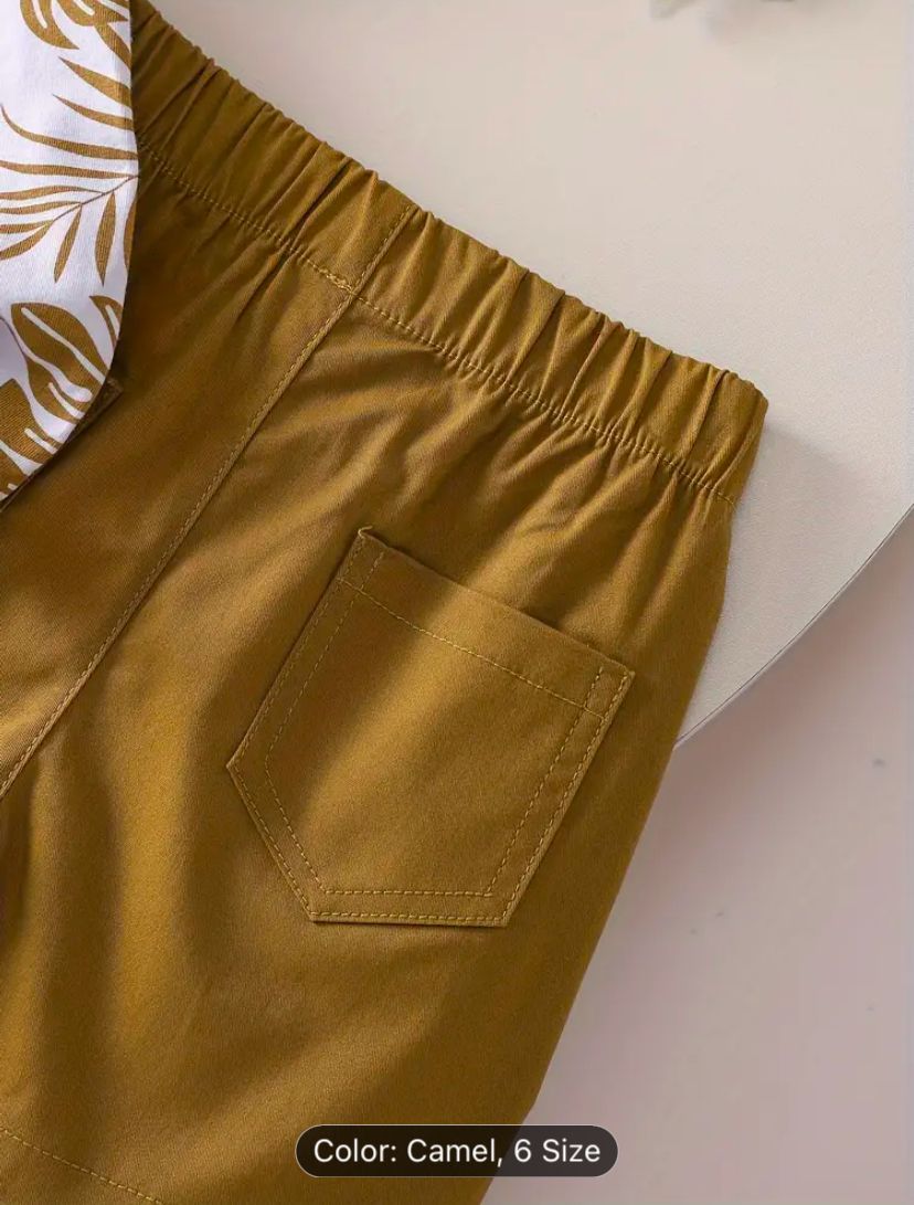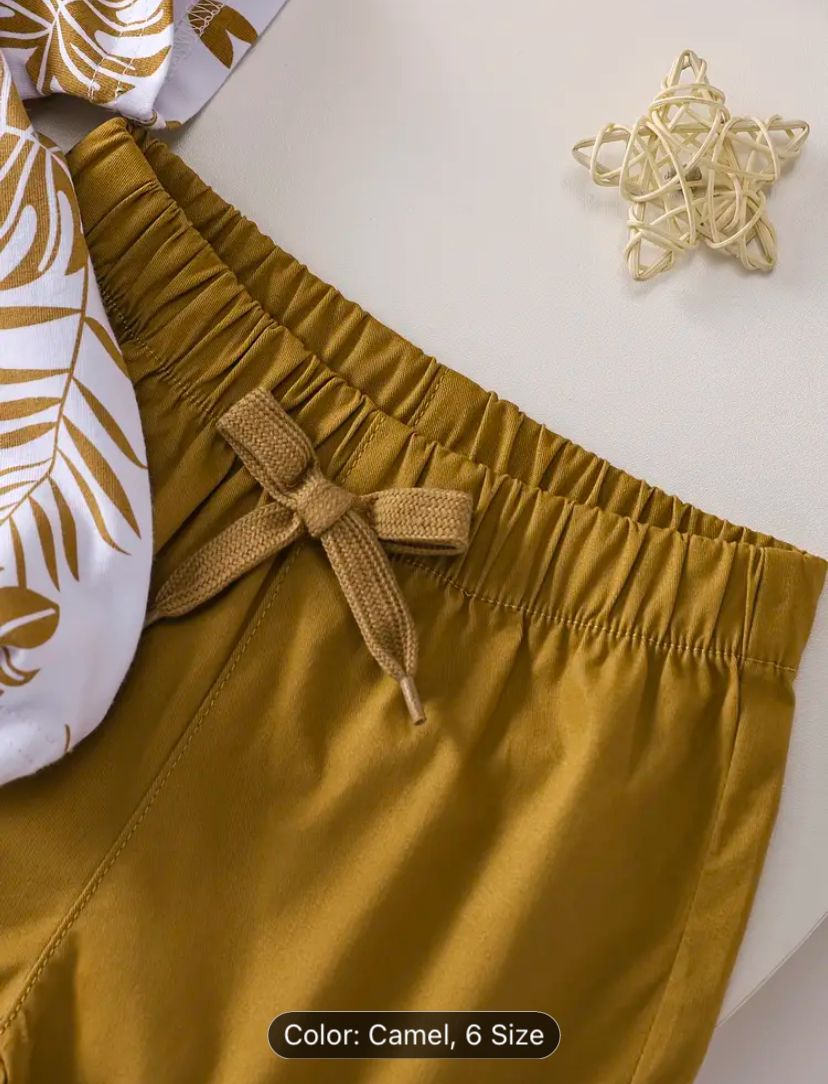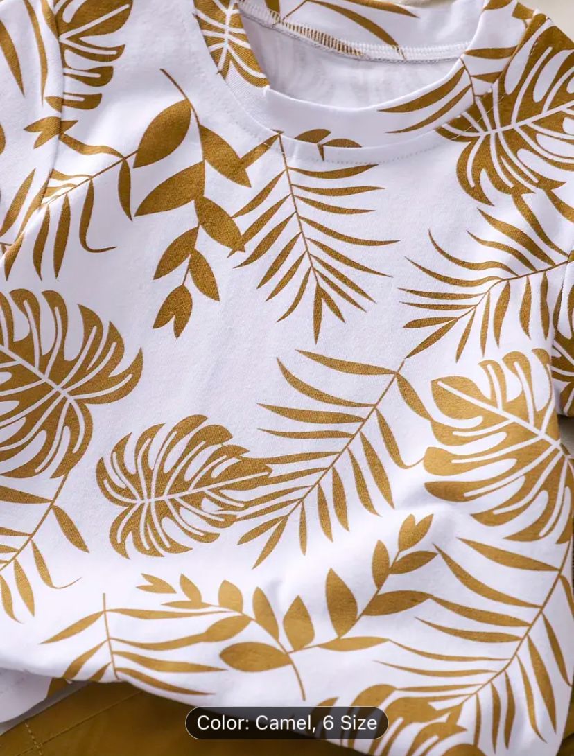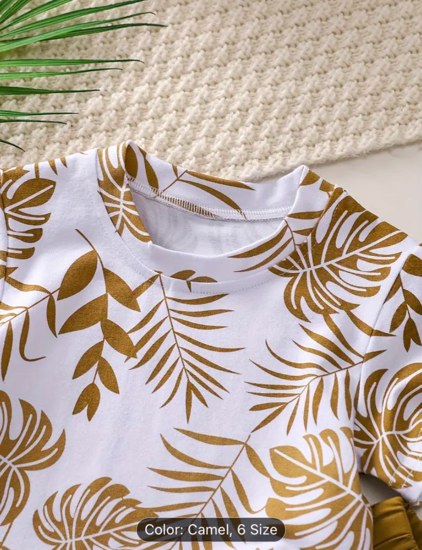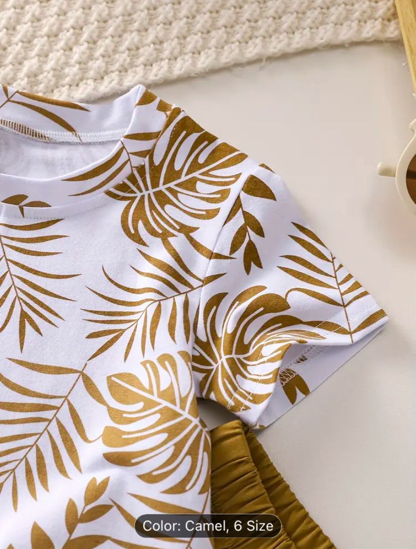 Boys' Tropical Leaf Print Cotton Blend Casual Outfit - Short Sleeve Tee & Drawstring Shorts Set, Machine Washable for Spring/Summer, Perfect for Outdoor